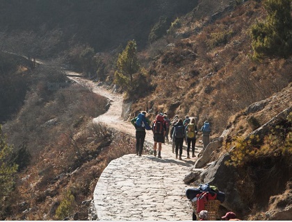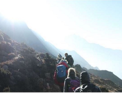 Shortly after our break, Max became the first group member to be taxed and was consequently given the nickname Maxi-Taxi. We continued our slow progress across the glacier and eventually made it to the other side intact. Lunch time introduced the group to a new method of using a ‘squat toilet’. I won’t mention names or go into the gory details but it involved one member of the expedition recounting her technique which involved closing eyes, removing shoes, removing pants and placing a bobby-pin on the nose. With bellies full of Lakpa’s diabetes-filled deep fried apple-chocolate-biscuit things we continued to walk towards Thare. Doug assured us the reminder of the walk would only take 90mins and foolishly we believed him. We crossed some open Tassie style plains before ascending a narrow goat-like track into the clouds. Whilst walking, the girls practiced their synchronized sniffing (the tissue shortage is getting serious!) and we struggled through the dust. The track winded its way around the hillside past a few frozen waterfalls before a medieval looking village emerged from the clouds. After the 150min walk we were glad to arrive at our home for the night.