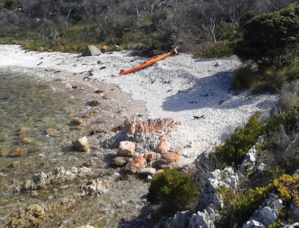 The early morning start was cancelled because the strong southerly was still blowing at dawn. By mid morning it was dying away quickly so I set off aiming for Shepherds Bay on Hunter Island. Across the channel I spied a narrow strip of what looked like sand closer to the tip I need to paddle around tomorrow, so I changed plans again and steered for it. It turns out to be less like sand and more like pebbles but I managed to get the tent up in flat spot above high tide.