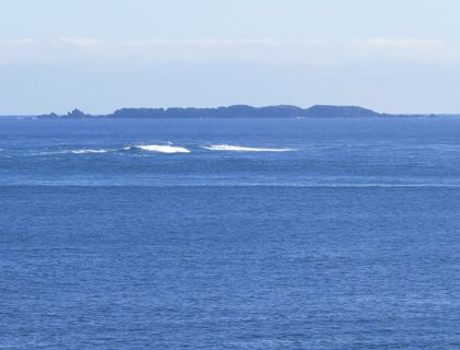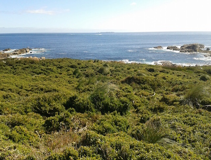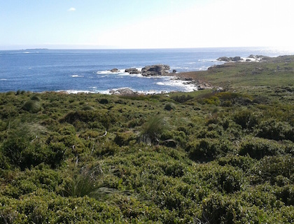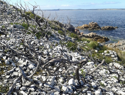There was a big fire here a year or two ago that has burnt most of the top part of the island. On the ground new plants are quickly growing up but it has left the dead sticks of the burnt shrubs and trees. I walked up to the top along a rough track and could see over to Albatross Island across the Dangerous Banks. This is a shallow patch of water with waves breaking over it. Have to paddle well clear of it tomorrow. Walking back to camp a large pod of 15+ dolphins came south down the channel below me. It's become so calm I could hear them blowing air as they jumped ahead of each other. Tomorrow to Albatross!
