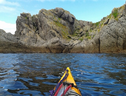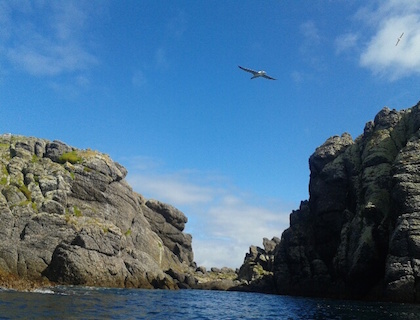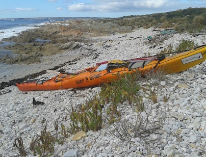 Turning to head back to Hunter Island the wind dropped out completely and I paddled in silence. A pod of dolphins and a couple more seals broke the surface but otherwise it was silky smooth. As I came in to Cuvier Bay a strong tidal steam popped up with churning boils and cascading little waves. Just like being in a river. It pushed me quickly down the coast and I settled on a campsite in a narrow gulch facing north. I'm calling it Dead Cow Bay. On the rocks I found a large buoy with a rubber tail and some broken electronics. I'm guessing it was a scientific device but not sure. Anyone recognise it? More variable winds tomorrow and I'm heading south to the bottom of Hunter.