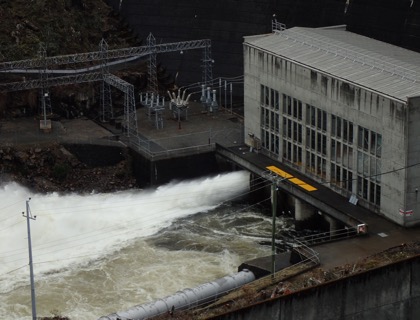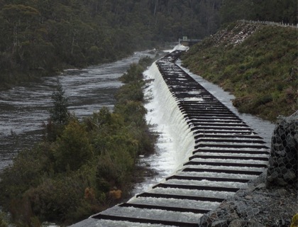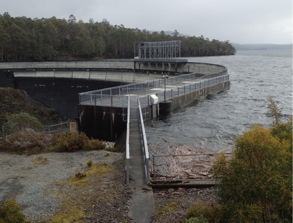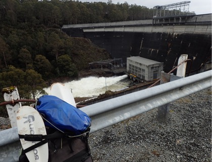 With the showers passing I rolled up Dave the Ruby Currant into a small ball and shoved it in the bottom of my pack. Everything else went on top and the paddles on the side. With this towering pack I set off down the road on foot as I'd reached the end of the lake. The dam wall that holds the river up is simply huge and at the foot of it is the Butlers Gorge Power Station. Transmission lines shoot off full of electricity to join the grid down the line.