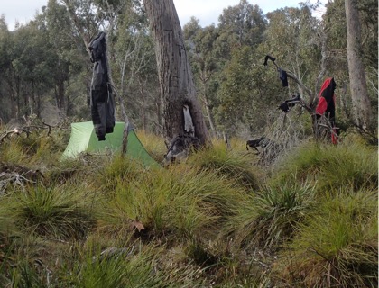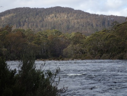 I continued along the road beside the canal until finding a good campsite in a buttongrass plain near the river. I pushed through the scrub to the river for a look. I can't paddle this section because there are some serious rapids between here and Wayatinah and I'd very likely drown. More walking tomorrow. What is that bloodsucker on my hand?
