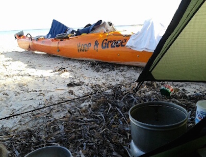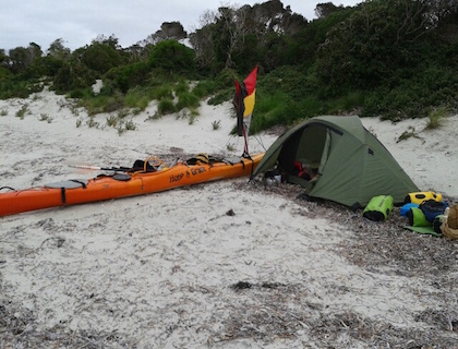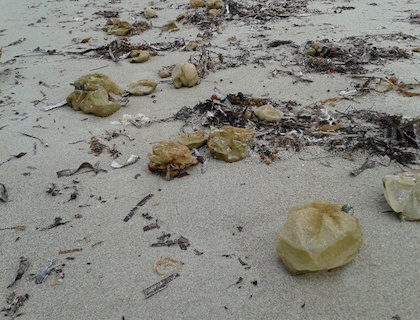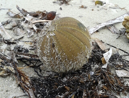 Into Hunter Passage I passed the southern tip of the island and entered calm waters. My shoulder was aching so I looked for a campsite on Stack Island. It's a small island with mostly rocky coast and a little beach. Washed up on the sand I found little sacks of something like seaweed (photos), but I don't know anything about them. They are natural and float with air in them. Are they a type of seaweed, egg sac of something else? I also found the shell of a sea urchin. It's amazing how the shell survives being tossed up on the beach as they are very thin and fragile.