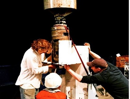 In photo 1 members of the science team pull up a gravity core for processing. These are slowly lowered to a depth of 100 metres off the seafloor then essentially dropped. After they're pulled back to the surface we hopefully are left with a cross section of what the ocean floor looks like from the surface to a metre or so down.
