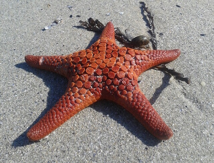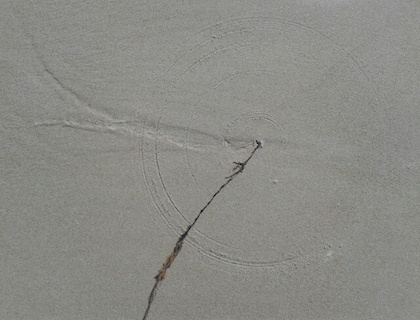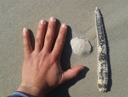 There is a photo here of a piece of half buried seaweed that the strong wind has been blowing on the wet sand. It created a neat circle and made me wonder where other shapes either grow or are formed in nature? I've landed at Shepherd's Bay near the top of Hunter Island. The wind is strong and with the sail up I surfed up the coast at great speed. Sometimes without paddling I was being pushed down the small waves and surfing. The only problem is that I didn't have to paddle much and became cold to the very core. After quickly setting up camp in the dense tea tree forest I washed the salt from me and ran up and down the beach to warm up. It did a good job but I still decided to jump into the sleeping bag for extra warmth. Later, on the beach I found one full starfish and one piece of a starfish. The piece, or leg, is from a different species and, you can see from the size of my hand, very long. They must have blown ashore on the strong wind.