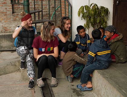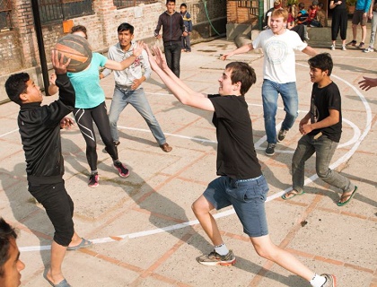 We piled back onto the bus at the embassy, and made our way along some seriously bumpy roads, avoiding all manner of powerlines, motorcycles, people, and cars, eventually arriving at Childhaven Orphanage. Kanya, manager of the orphanage, gave us a tour of the rooms and facilities. The message of the severity of the gas crisis was driven home when we were shown a completely vacant kitchen of gas stoves, and then shown the wood fires that they were in fact cooking over. In driving around Kathmandu, you will also pass fuel stations crawling with police personal, and drive alongside lines of empty trucks and busses waiting for fuel that we were told are four days long. Despite this setback, I struggle to think of a place that is more explicitly joyful than Childhaven. Every child we passed, whether 7 or 17, was smiling, and enthusiastically said ‘namaste’. And, as if it was contagious, it was not long before our whole group was also smiling and returning the greeting. We were promptly challenged to a game of basketball, and I would be lying if I claimed that we were not made fools of. Balls went between our legs, over our heads, and they effortlessly dodged and ran around us. It was all in good spirits, and there were many laughs and smiles on both sides. When it came time to leave, we reluctantly got back on the bus while it was surround by the young children, waving and saying goodbye. As we drove away they stood at the gate and waved until we were out of sight, and many comments were made about the happiness of the place.