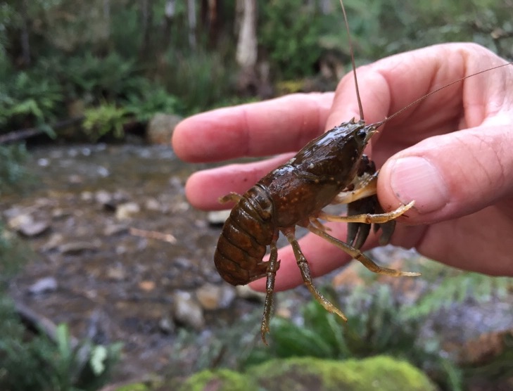Dr Alastair started the day by fishing a freshwater crayfish out of the Arve River. Not a burrowing one like last week, but one of the three river dwelling species- Astacopsis tricornis. Sue went in for a closer look and copped a nasty pincer injury. 'Ow, actually it really hurts.' Alastair advised popping it on the ground but it only let go after grabbing a second finger and drawing blood. Fantastic, there has not been enough blood on this trip so far. A measly leech bite is all I can claim. A crayfish clawing, now that is a story.