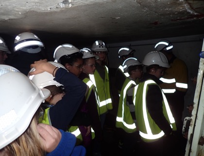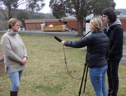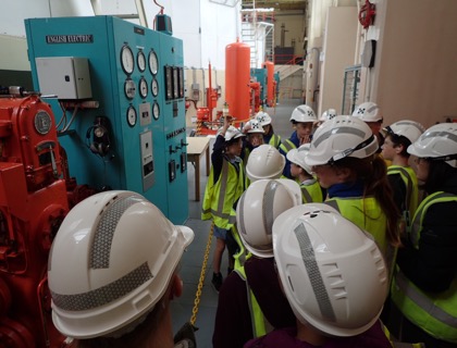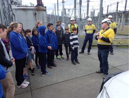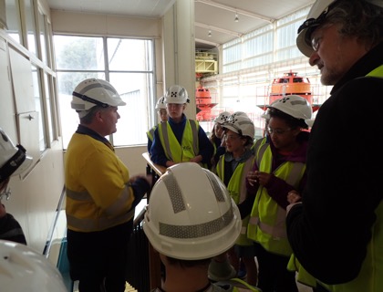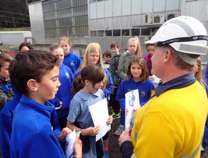 I was waiting outside the gates to greet the team from Landsdowne Crescent, Albeura Street and Campbell Street Primary's. Our curriculum writer Kara and film team from Rosny College were along too. Roger from Hydro Tasmania met us for an inside look at Liapootah. From the road it looks like a massive shed with three huge pipes running down the hill into it with a river emerging the other side. Those pipes are full of water from the Nive and Derwent River and they each spin a turbine to generate electricity. You'll have to tell me the exact science of it because I couldn't hear Roger's explanation over the roar of the machines and water.