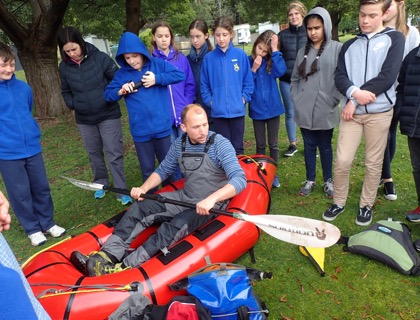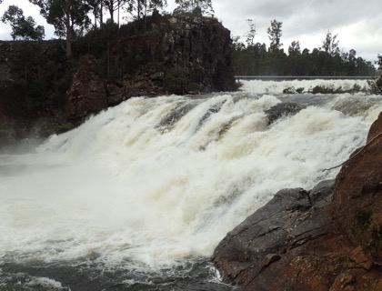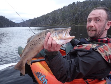 We quickly ate lunch and checked out Dave the Ruby Currant. Zara, one of the students here, is responsible for the currant part of the name! Once the bus departed I jumped in and paddled to the spillway of the lagoon. There's an impressive waterfall at the moment but it's normally dry. Apparently people do kayak down it but not this little Ruby Currant, no siree. I hauled out and walked over the Lake Catagunya to avoid the last really dangerous part of the river. I launched again because I saw a fisherman in a kayak. This is Jason and he's holding up a very decent brown trout. He comes up every few weeks in the season for a quiet fish in the lake. Bring on the weekend and more paddling.