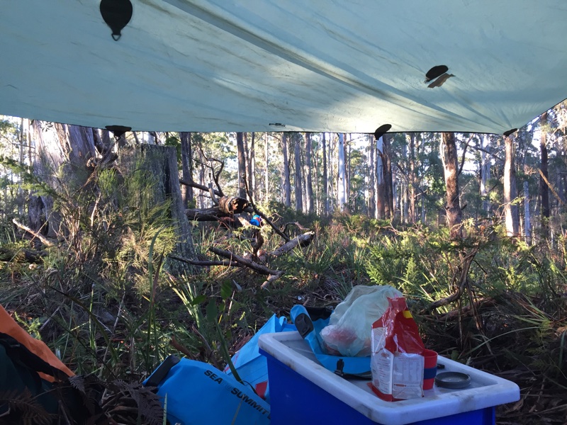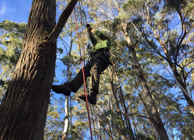 Once our toes were warmer we began the task of taking down the ropes on our small tree so we could begin setting up in... we need a name for our main tree! Any ideas?? It's a Eucalyptus obliqua or stringybark, it has a huge burl near the base, hollows aplenty, has dropped a few limbs over its long life and deserves a respectful name. Suggestions on the board welcome.