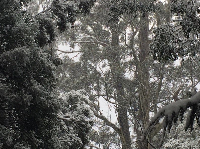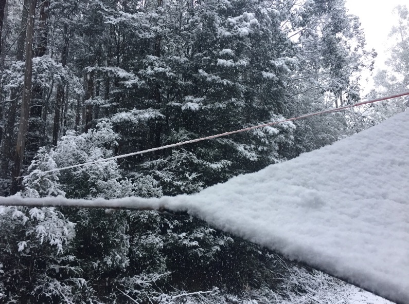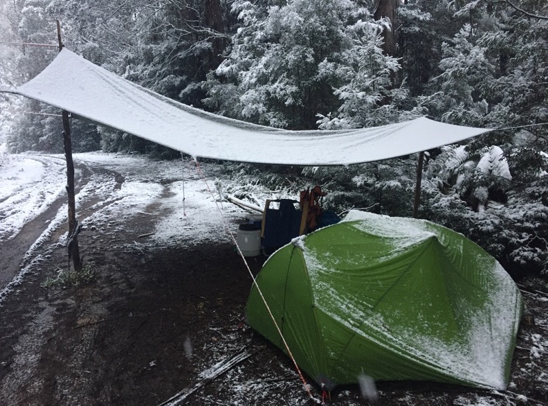 Wowee, what a wonderful sight. The snow drifted and swirled over the road and through the forest. The tops of the tree ferns below my camp were draped with a few centimeters at least. Up on the tall trees the branches were crusted with white and the tarpaulin hung down low under the weight of the white powder.