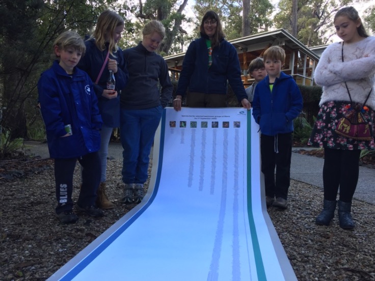 The young scientists tuned in their eyes and began spotting interesting forest features. An exploding fungi here and Pygmy possum sized tree hollow there. Dr Sue brought out the Warra Toilet Roll st the end of our walk. It's a huge list with columns for how many mammals, birds, vascular plants (trees, shrubs etc.), lichens, bryophytes (mosses, liverworts and hornworts), fungi and beetles there are at research site nearby called Warra. It's surprising to learn how many species of each group of plants and animal have been found so far. Mammals have the least number species by a long way. Which group from the list above do you think has the most number of species?