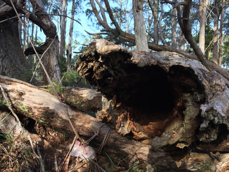 In between I had a chance to climb a little higher and I could nearly see inside a huge tree hollow. It must have been the one the possum scarpered from the other day. Reaching across I could just get the camera in there to take a photo and video. Nothing at home today. Down on the ground there were more hollows in the fallen limbs (another word for branches) and I couldn't help but look for a few more cryptozoans. See the video for some of them.