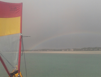 At first light I thought it might be another day in the shack but as the morning wore on, the wind and showers eased. By the time I'd packed and carried everything down to the channel the tide was getting low. I put the sail up and glided east without paddling. At the mouth of the channel dark fishy shapes darted beneath the kayak in the clear shallows. Over the sandbar and I adjusted the sail to catch a smidge of the westerly and began paddling. The sail is a square rigger but it can catch a tail wind, cross wind and even a breeze coming from just forward of your paddling arm. Its great fun and saves a bit of energy.