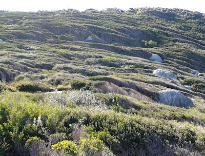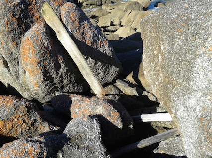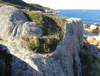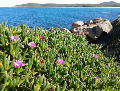 In shore i've been exploring the rocky coast. Around the headland I found a stinky cave and some old timbers which might be from a shipwreck. The vegetation (plants) around here must get battered by the icy wind because they're packed close together, are as tough as wire and hide behind the rocks for protection. The pigface (pink flowers in the photo) is soft but hugs the grounds. Tomorrow I need to walk the long beach in search of water. There is a creek marked on the map so hopefully it's flowing and fresh.