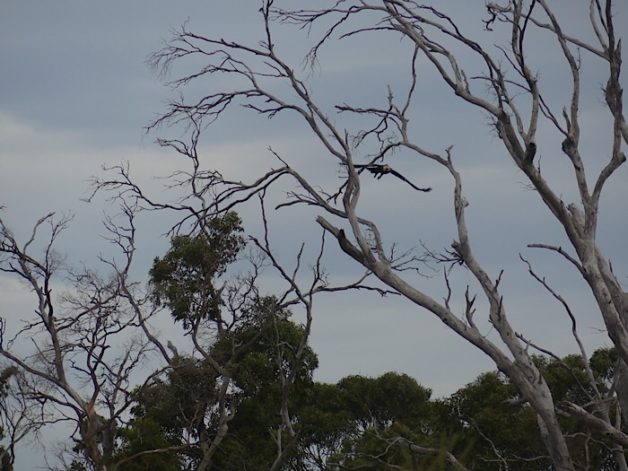 It far down the track James spotted an eagle perched in a dead tree. It was Ernie. When he flew away we could see the light coloured feathers of a young bird. It was confirmed soon afterwards when two more eagles came into view, soaring up high. Ernie’s parents. Wow!